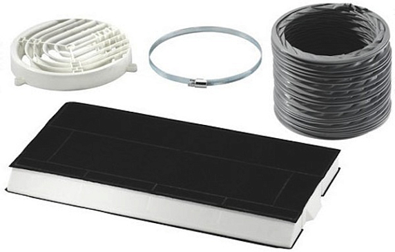 Комплектация Состоит из: угольного фильтра, дефлектора, гибкой трубы ø 150 мм длиной 800 мм с 2 зажимами, а также крепежных элементов.