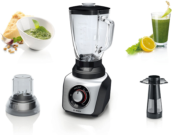 Блендер Bosch MMB64G3M подходит для приготовления горячих и холодных супов и напитков. Предусмотрены специальные режимы для кубиков льда и смузи. Измельчитель справляется с такими твердыми продуктами, как зелень, орехи, твердый сыр, шоколад, лук. Фильтр-сито поможет приготовить смузи без кожицы и семян и соевое молоко.