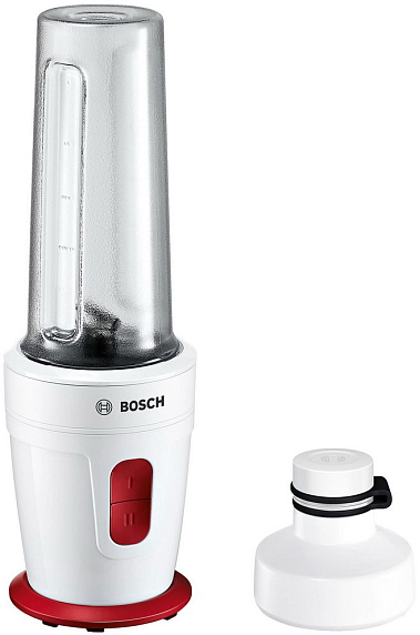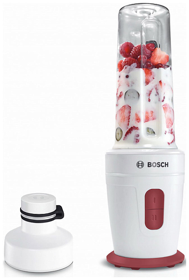 Блендер Bosch MMBP1000 в белом цвете с красными элементами на корпусе сочетает в себе стиль и функциональность. Бутылочка 2Go служит одновременно чашей измельчителя и позволит хранить и переносить в ней напиток.