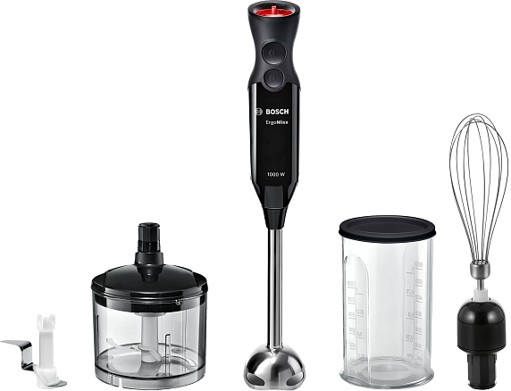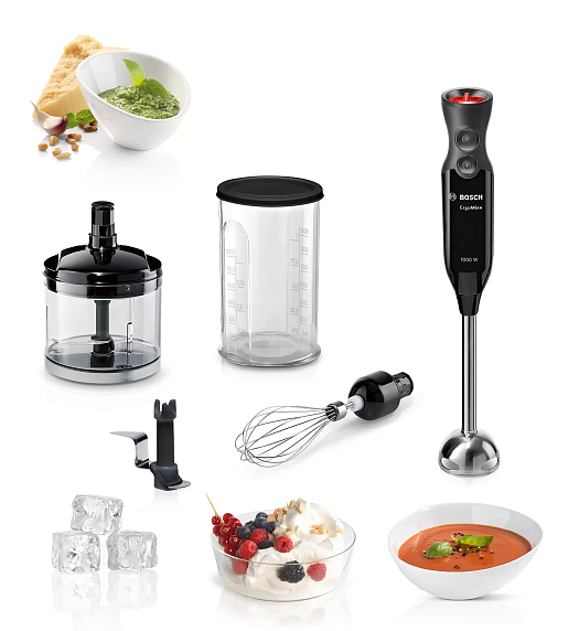 Блендер Bosch MS 61B6170 качественно измельчает продукты, пюрирует и смешивает соусы до однородной консистенции. Мерный стакан с крышкой для измерения объема, смешивания и хранения продуктов. С невероятно высокой мощности мотора 1000 Вт и наличию разнообразных аксессуаров, даже самые твердые ингредиенты можно переработать очень быстро и легко.