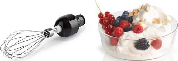 В комплект входит венчик для взбивания, мерный стакан, а также насадка-комбайн. Она состоит из универсальной чаши с ножом для измельчения пищи, а также четырех режущих вставок для шинковки и терки. Уход за съемными деталями блендера довольно прост, так как их можно мыть в посудомоечной машине. Устройство произведено в Евросоюзе, а его срок годности составляет 12 месяцев.