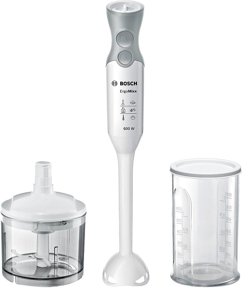 Погружной блендер MSM 66020 — легкая и компактная модель в белом цвете с серыми элементами на корпусе. 12 скоростей измельчения позволят подобрать наиболее подходящую для определенного блюда