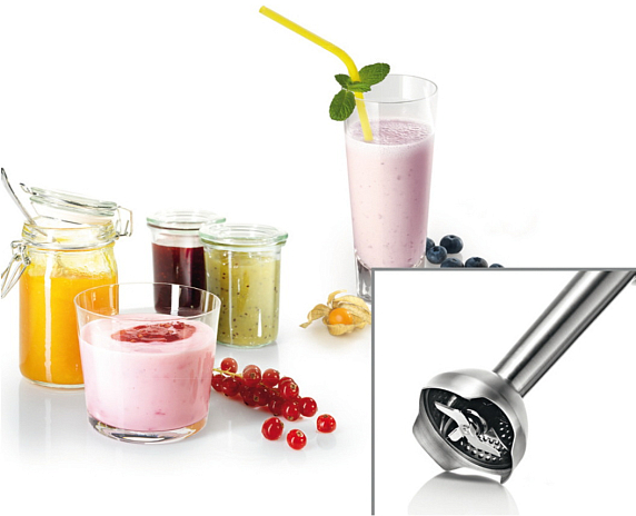 Эргономичная ручка с большими кнопками и мягким антискользящим покрытием легко ложится в руку, насадки удобно менять. Четыре острых лезвия QuattroBlade Pro быстро измельчают продукты, интенсивность обработки можно регулировать при помощи 12 скоростных режимов.
