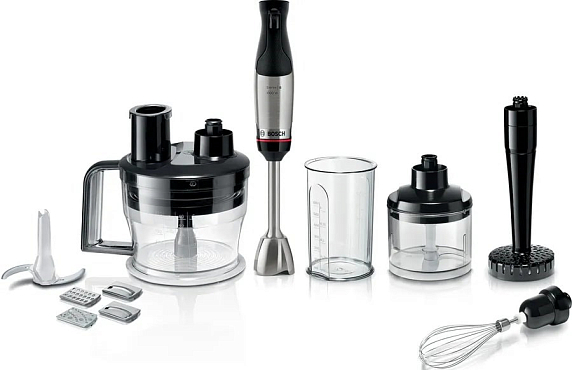 Блендер Bosch MSM6M673 представлен в классическом черном цвете, что подчеркивает его элегантность и современный дизайн. Корпус устройства выполнен из сочетания нержавеющей стали и пластика, что обеспечивает его прочность и долговечность. Погружная часть блендера изготовлена из металла, что гарантирует эффективность и безопасность его использования. Данная модель оборудована измельчителем, чаша которого сделана из пластика. Нож блендера имеет 4 лезвия, что позволяет быстро и равномерно измельчать продукты. Управление блендером осуществляется при помощи кнопок, что делает его использование простым и удобным.