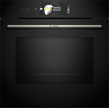 Духовой шкаф Bosch HMG778NB1 в черном оттенке с фурнитурой из нержавеющей стали отражает стремление к лаконичности и практичности: строгие линии, минималистичная фронтальная панель и аккуратная интеграция элементов управления создают презентабельный ансамбль, который легко вписывается в интерьер самой разной концепции. Неброский, но выразительный дизайн подчеркивается 2.5″ цветным TFT-дисплеем с сенсорными кнопками, где интуитивные иконки и цветовая индикация упрощают навигацию по обширному набору функций и режимов. Переключатель Control Ring обеспечивает тактильный отклик при выборе параметров, а электронное управление придает интерфейсу современную точность: команды выполняются быстро, отклик детализирован и предсказуем.
