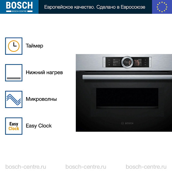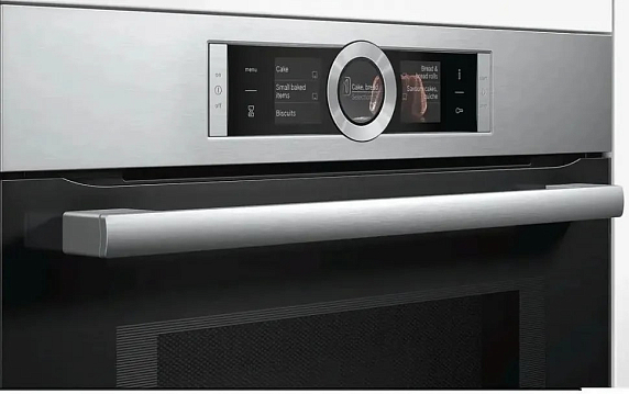 Электрический духовой шкаф Bosch CMG656RS1I выполнен в цвете «нержавеющая сталь» и оснащен электронной панелью управления в виде TFT-дисплея, переключателя ControlRing и сенсорных кнопок. С помощью них можно выбирать 1 из 12 режимов нагрева и другие дополнительные функции. Микроволны используются как отдельный режим, так и совместно с режимами нагрева. Светодиодные лампы обеспечивают яркий и равномерный свет внутреннего пространства духовки. EcoClean Direct задней, боковой стенки и потолка — покрытие, которое впитывает жир и загрязнения и разрушает их за счет процесса окисления.