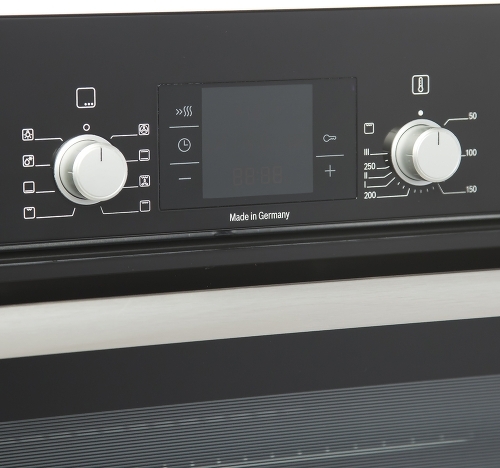 Переключатели утапливаются в панель управления. Это даёт возможность предотвратить случайное изменение заданных настроек. Все выставленные параметры отображаются на небольшом дисплее. Многофункциональные часы, помимо постоянного использования в основном режиме, можно использовать как таймер. Программа позволяет установить время приготовления, начала или окончания работы. Лампа подсветки включается автоматически, с началом работы духовки.
