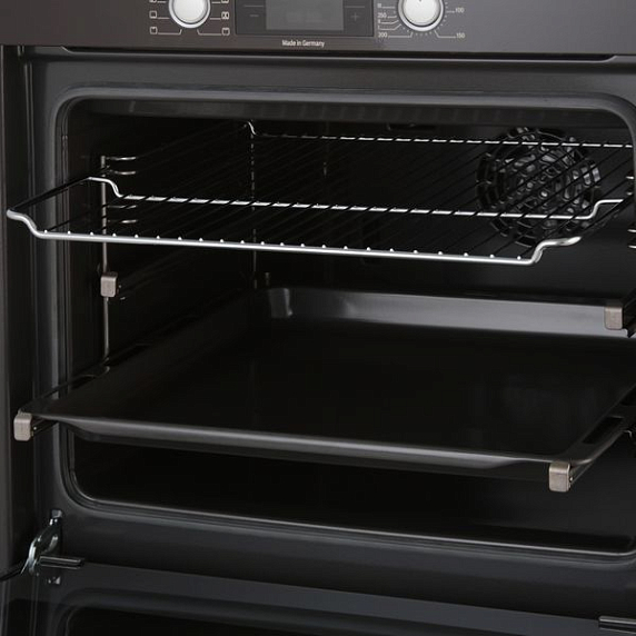 Гриль расширяет функциональные возможности модели. Конвекция в комбинации с грилем идеально подходит для приготовления больших кусков мяса или курицы с аппетитной хрустящей корочкой и сочной сердцевиной. Система двухуровневых телескопических направляющих обеспечивает дополнительный комфорт и безопасность при обращении с горячими противнями. Блокировка панели управления от детей предотвращает случайное включение прибора. Специальный вентилятор охлаждает корпус духового шкафа и исключает риск перегрева внешней поверхности.