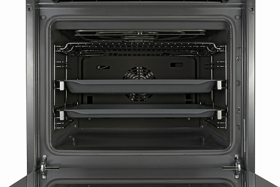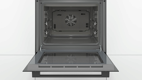 Чтобы не тратить много времени на чистку духовки от жировых отложений, все внутренние панели в Бош HBF554YB0R изготовлены из пористой многослойной керамики EcoClean. Она впитывает в себя жир, а затем при нагревании расщепляет его на экологически безопасные составляющие – уголь и воду. Таким образом, поверхность самоочищается без вашего участия сразу же во время работы устройства.