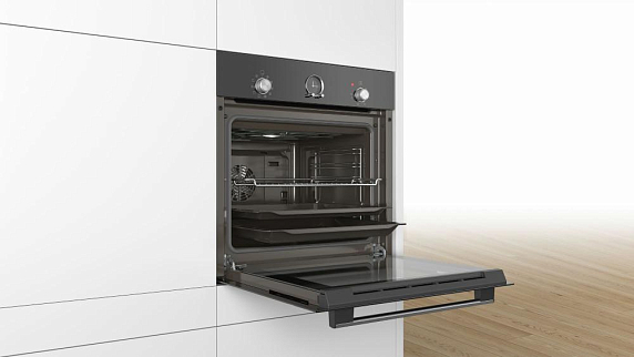 Духовой шкаф Bosch HBFS10BB0R — встраиваемая модель с функцией гидролитической очистки. В комплект входят: решетка, универсальный протвень и эмалированный противень для выпечки