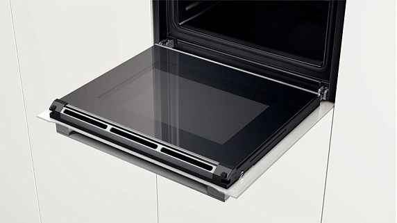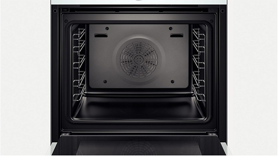 Внутренние поверхности в Бош HBG634BW1 изготовлены из самоочищающихся панелей EcoClean (задняя стенка) и покрыты антрацитовой эмалью высокой очистки (боковые). Таким образом уход за духовкой не составит большого труда.