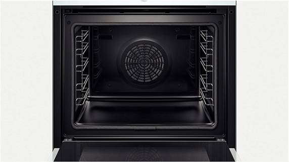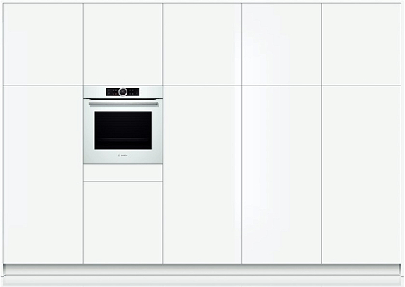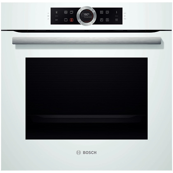 Духовой шкаф Bosch HBG672BW1F выполнен из комбинации белого стекла и нержавеющей стали. Панель управления — полностью сенсорная, с центральным плоским поворотным регулятором в виде кольца.