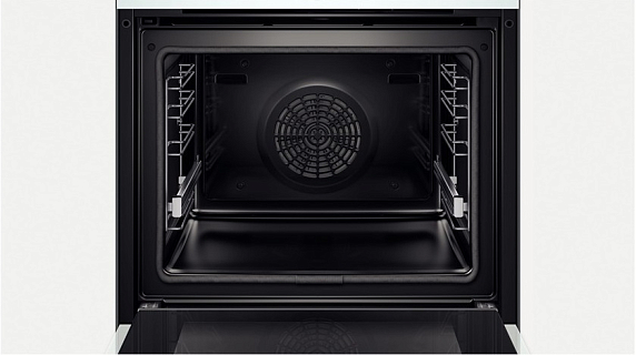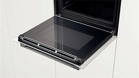 Духовой шкаф Bosch HBG6750W1 оснащен пиролитической очисткой, загрязнения под воздействием высоких температур превращаются в пепел, поле необходимо протереть внутреннюю поверхность влажной тканью. В модели предусмотрены одноуровневые телескопические направляющие, которые позволят безопасно выдвигать горячий противень. Индикация остаточного тепла указывает на высокую температуру в духовке.