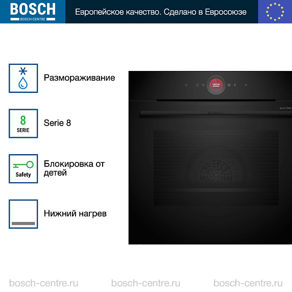 Духовой шкаф Bosch HBG9742B1S из премиальной линейки Serie | 8 — это образец современной кухонной техники, где продуманная эргономика встречается с передовыми технологиями. Его строгий чёрный корпус придаёт кухне утончённый и минималистичный вид, идеально вписываясь в интерьеры любого стиля. Независимая конструкция и стандартные габариты (59,5 × 59,4 × 56,7 см) обеспечивают лёгкую встройку в любую кухонную мебель без сложных адаптаций.