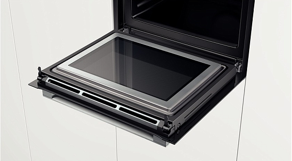 Нижний жар идеально подходит для поджаривания или выпекания пирогов с сочной начинкой. Гриль с конвекцией равномерно пропекают блюдо и придают хрустящую корочку. Керамическое покрытие EcoClean расположено в самом труднодоступном для очистки месте — задней стенке. Пористое покрытие превращает загрязнения в легко стираемый налет. Телескопические направляющие обеспечивают плавное выдвижение и комфортный доступ к приготавливаемому блюду.