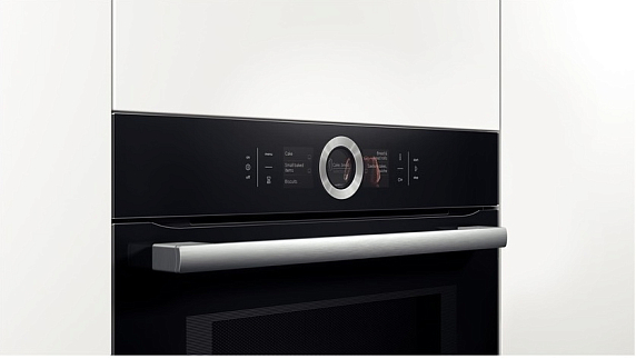 Модель черного цвета оборудована серебристой фурнитурой из нержавеющей сталь, что придает ей элегантный и современный вид. Габариты духовки составляют 59.5 см в высоту, 59.4 см в ширину и 54.8 см в глубину, что делает ее достаточно компактной и удобной для встраивания. Для установки прибора потребуется ниша размерами от 58.5 до 59.5 см в высоту, от 56 до 56.8 см в ширину и 55 см в глубину. Управление выполняется с помощью электронного сенсорного переключателя Control Ring, что делает его эксплуатации удобным и интуитивно понятным. На 2.5-дюймовом цветном TFT-дисплее отображается вся необходимая информация и управление настройками.