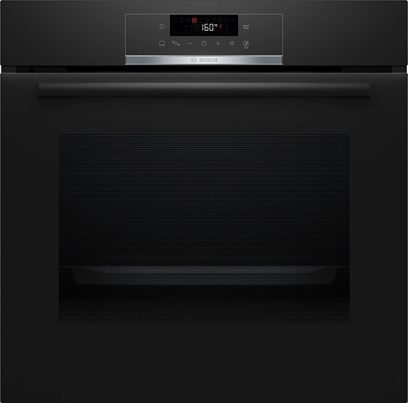Духовой шкаф Bosch HQG572EB3 представляет собой продуманный электрический прибор из серии Serie 4 с независимой установкой, выполненный в строгом черном цвете с черной фурнитурой. Внешняя эстетика сочетает минимализм и практичность: гладкая фронтальная панель с сенсорными элементами управления и аккуратным LED-дисплеем подчеркивает современный характер изделия, а откидная дверца с амортизатором SoftOpen плавно и безопасно опускается, добавляя ощущение качества при каждом использовании. Четырехслойное остекление обеспечивает надежную теплоизоляцию, а температура наружного стекла не превышает 30 °C, что снижает риск ожогов при случайном прикосновении и делает прибор более комфортным для семьи с детьми.