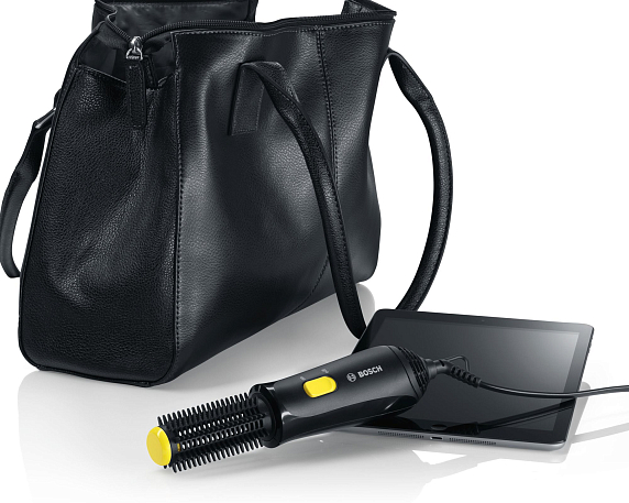 Щетка для завивки горячим воздухом Bosch PHA 1151 из компактной серии Style-to-go подходит для быстрого обновления образа: просушивание мокрых волос, лононы, объем от корней, завивка кончиков внутрь или наружу. Прибор имеет комбинированный переключатель скорости и температуры. После укладки используйте холодный обдув, чтобы зафиксировать прическу на более длительный срок.