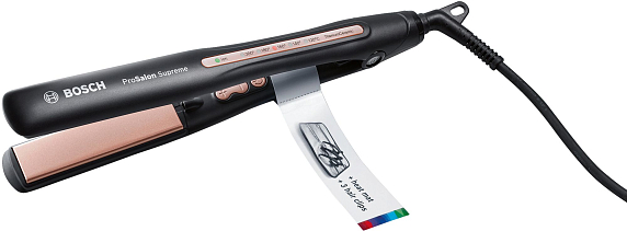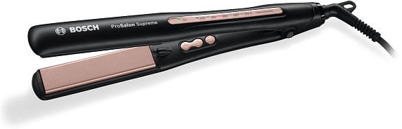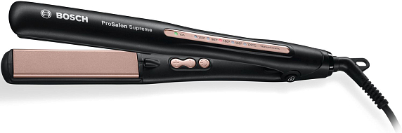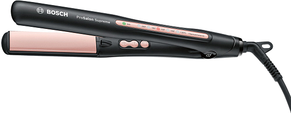 Выпрямитель Bosch PHS9948 — новинка из серии ProSalon Supreme Sleek&Curl. Прибор отличают удлиненные пластины с покрытием TitaniumCeramic для быстрого и бережного выпрямления. Благодаря ионизации волосы становятся послушными, гладкими и блестящими. Нагревается всего за 25 секунд, термостойкая подстилка убережет поверхности от подпалин.