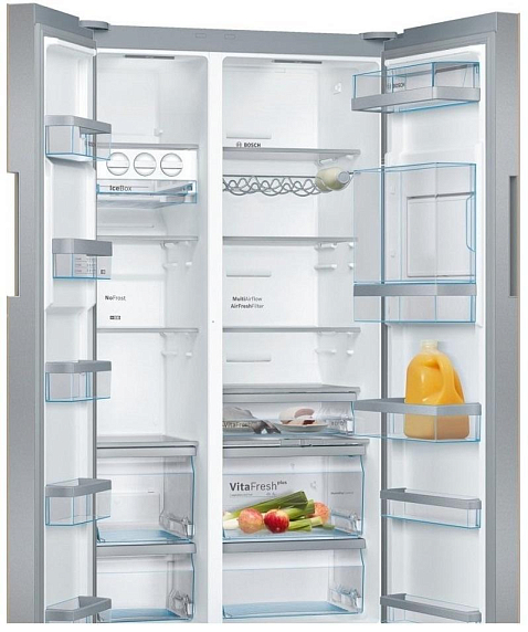 Холодильник Side-by-Side Bosch KAH92LQ25R выполнен в бежевом цвете. Холодильная камера оснащена 4 полками, 2 из которых можно регулировать по высоте. Есть зона свежести VitaFresh, позволяющая продлить срок хранения продуктов. Морозильная камера оснащена полками и ящиками, а также ледогенератором. Удобное электронное управление и дисплеем делают эксплуатацию простой и понятной.