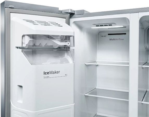 Этот аппарат оснащен системой No Frost, что исключает необходимость ручного размораживания. Автоматическое размораживание холодильного отделения обеспечивает дополнительное удобство в использовании. Система MultiAirflow гарантирует равномерное распределение холодного воздуха по всему объему холодильный шкафа, что позволяет сохранить свежесть продуктов на долгое время. Функция суперохлаждения позволяет быстро охладить большое количество продуктов, что особенно актуально после большого обновления запасов. Этот прибор оснащен автоматической системой размораживания и системой NoFrost, что обеспечивает постоянное обновление воздуха и предотвращает образование инея. Мощность замораживания составляет 13 кг за 24 часа, а автономное сохранение холода — 8 часов. В нем также предусмотрена функция суперзамораживания SuperFreezing, благодаря которой продукты замораживаются быстрее, сохраняя свои полезные свойства. Особенностью является наличие системы подачи холодной воды и ледогенератора. Тип ледогенератора — автоматический, что позволяет всегда иметь под рукой свежий лед.