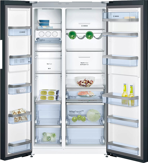 Холодильник Side-by-Side Bosch KAN92LB35 — новинка, оснащенная большой морозильной камерой с полками: заготавливайте больше запасов! Контейнеры VitaFresh Plus плавно и легко выдвигаются на телескопических направляющих. Они просты и удобны в обращении.