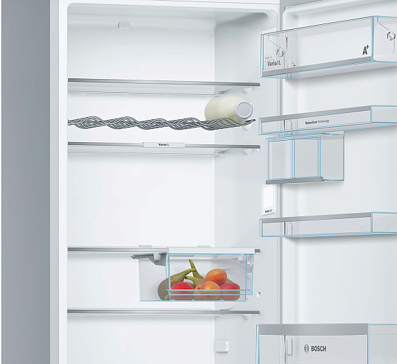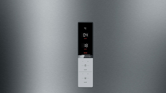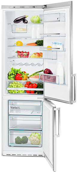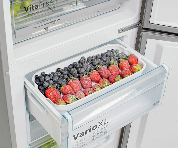 Боковые стороны окрашены краской Chrome Inox-metallic. При помощи дисплея возможно установить температуру в холодильном и морозильном отделениях с точностью до 1 градуса. Технология NatureCool и система охлаждения LowFrost поддерживают естественную свежесть продуктов, они надолго сохраняют вкус и привлекательный внешний вид. Разморозка требуется всего 1-2 раза в году. Благодаря системе VarioXL внутреннее пространство легко трансформируется под потребности пользователя.