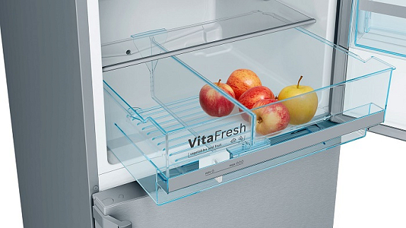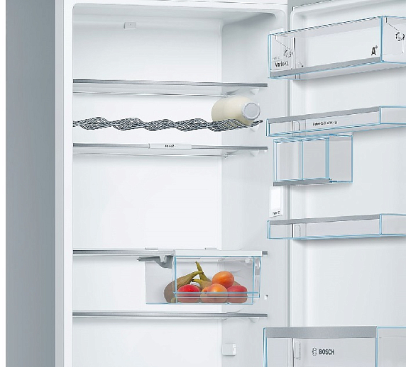 Холодильное отделение укомплектовано 5 полками из стекла, 4 из которых регулируются по высоте, хромированным подвесом для бутылок, зоной свежести и малым ящиком. Управление прибором осуществляется при помощи сенсорной системы TouchControl. Климатический класс модели — SN-T.
