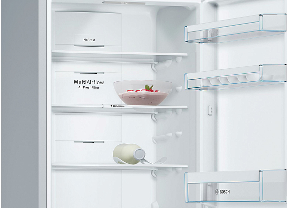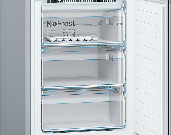 Двухкамерный холодильник Bosch KGN36VI21R цвета Chrome Inox-metallic оборудован системой охлаждения NoFrost. Вентиляторы отводят излишнюю влагу из рабочей камеры, поэтому наледь не образуется. Выдвижные полки EasyAccess позволяют легко загружать и доставать продукты.