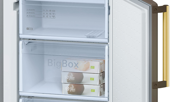 Модель Бош KGN39AD18R выделяется в первую очередь своим внешним видом. Теплый густой оттенок горячего шоколада отлично сочетается с большинством современной бытовой техники и мебели и придает кухонному интерьеру необычность. К тому же на нем менее заметны пыль, капли воды и отпечатки пальцев, а значит и протирать корпус нужно намного реже.