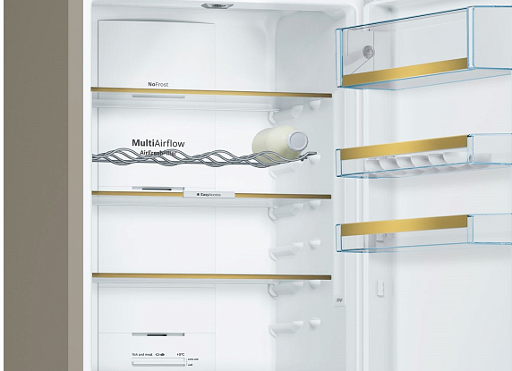Модель оснащена ярким и равномерным светодиодным освещением. Боковой и потолочный источники света расположены таким образом, что не перекрываются продуктами, поэтому содержимое полок и зоны свежести отлично просматривается. Длительность хранения при отключении электроэнергии составляет 16 часов.
