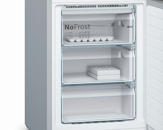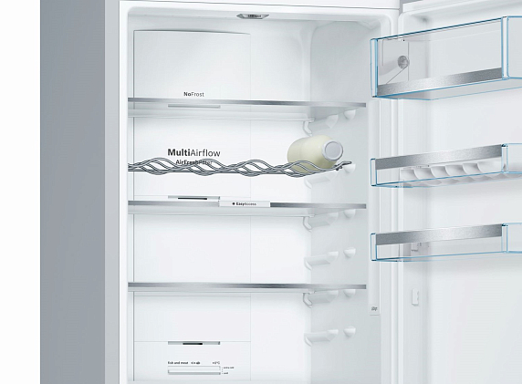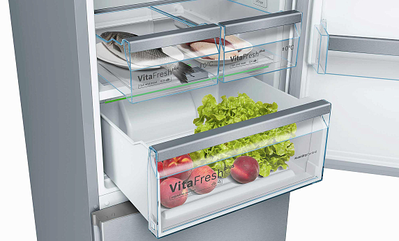 Особенности: настройка температуры около 0°C, ящик для хранения овощей/фруктов с 2 уровнями влажности, 2 ящика для хранения рыбы/мяса на специальных направляющих, которые можно выдвигать оба одновременно или по отдельности.