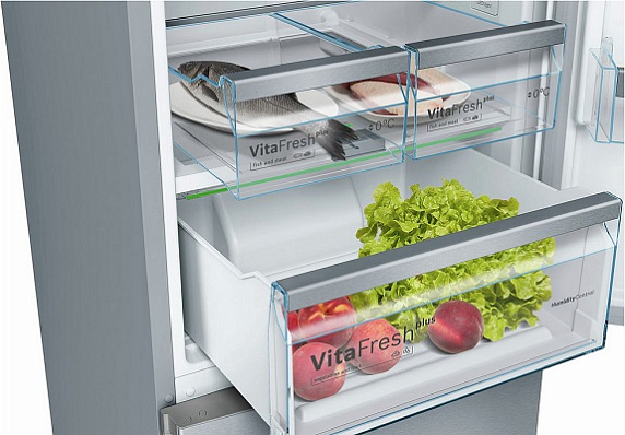 Холодильно-морозильная комбинация с технологией NoFrost и зоной свежести VitaFresh plus сохраняет свежесть продуктов до 2 раз дольше, благодаря оптимальному уровню влажности в ящике для овощей и фруктов и пониженным, регулируемым температурам в ящиках «нулевой» зоны для мяса и рыбы. Холодильник имеет одно из самых больших холодильных отделений (279 л) среди 2-метровых холодильников своего класса. Яркие светодиодное источники света расположены таким образом, что не перекрываются продуктами, поэтому содержимое полок и зоны свежести отлично просматривается.