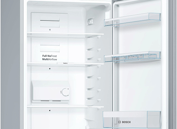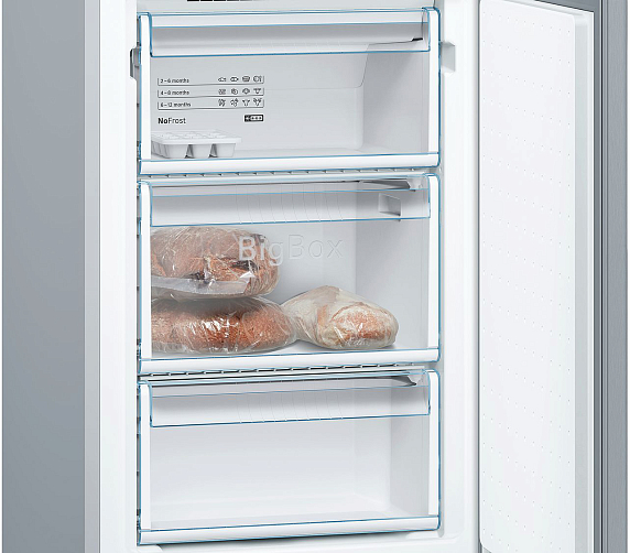 Прибор оборудован NoFrost, иней и наледь не образуются, поэтому систему не нужно размораживать. Ящик зоны свежести с регулировкой уровня влажности создан для хранения овощей и фруктов, волнистое дно защищает от конденсата.