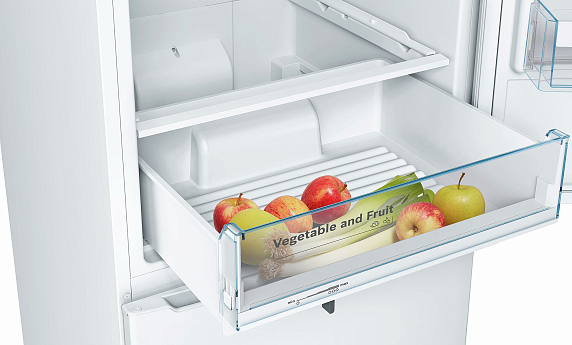 Двухкамерный холодильник Bosch KGN39NW14R обеспечивает длительное и качественное сохранение продуктов благодаря системе NoFrost. Отделение VitaFresh с контролем уровня влажности и волнистым дном создано для продления срока хранения свежих овощей и фруктов.