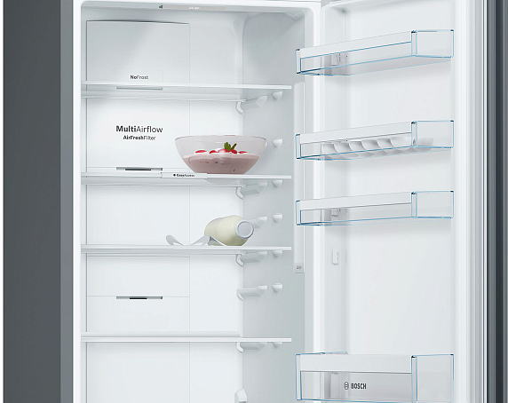 Двухкамерный холодильник Bosch KGN39VC2AR редкого оттенка «чугун» — модель с системой охлаждения NoFrost и зоной свежести VitaFresh. Прибор не нуждается в разморозке. Имеет одно из самых больших холодильных отделений 290 л среди 2-метровых холодильников своего класса. Раздельная установка температуры в холодильном и морозильном отделении производится при помощи дисплея на дверце. В ящике HyperFresh с регулировкой влажности и волнистым дном фрукты и овощи остаются свежими дольше.