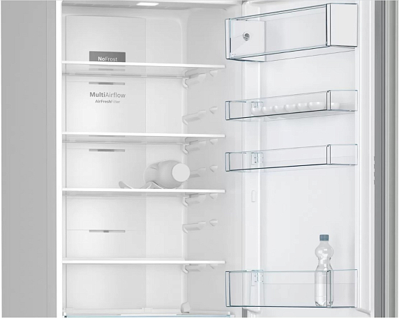 Двухкамерный холодильник Bosch KGN39VI25R — модель с покрытием под нержавеющую сталь и дисплеем на дверце. При помощи дисплея на дверце легко настроить температурный режим и выбрать специальные функции «Суперохлаждение» и «Суперзамораживание». Они обе используются для быстрой обработки большого количества свежих продуктов. Температура в рабочей камере заранее понижается на несколько градусов, поэтому, когда вы загружаете покупки, удается избежать подтаивания соседних упаковок в морозильнике и конденсата в холодильном отделении. Благодаря NoFrost излишняя влага отводится вентиляторами наружу, поэтому прибор нет необходимости размораживать. Для эффективного хранения овощей и фруктов предусмотрена зона свежести VitaFresh 0°C.