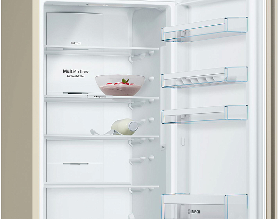 Дополнительные аксессуары Бош KGN39VK21R оптимизируют размещение продуктов внутри каждой камеры. Выдвижные полки EasyAccess сделаны из прочного стекла, устойчивого к ударам и резким перепадам температур. Прозрачные контейнеры в зоне свежести и морозильнике облегчают загрузку и выгрузку покупок и обеспечивают максимальный обзор.