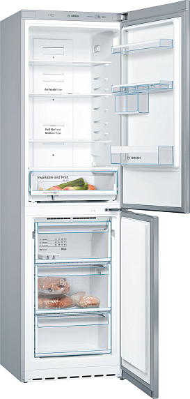 Модель представляет собой отдельностоящее устройство с морозильником, что позволяет эффективно использовать пространство и обеспечивает удобство использования. Особенностью данной модели является расположение морозильной камеры снизу. Такое решение позволяет удобнее и быстрее доставать продукты из холодильной камеры, которую мы используем гораздо чаще. Вместе с тем, морозильная камера также легко доступна для использования. Изобретение Бош KGN 39 VL 1 7R оснащен двумя камерами, что обеспечивает достаточно пространства для хранения продуктов. Благодаря этому, Вы сможете хранить большое количество продуктов и при этом они будут оставаться свежими и вкусными дольше. Одной из ключевых особенностей является функция FreshSense. Эта инновационная технология позволяет поддерживать оптимальную температуру в технике, что способствует длительному сохранению свежести продуктов. Модель от известного производителя обладает вместительностью 315 литров. Основное пространство холодильной камеры составляет 221 литр, что позволяет хранить большое количество продуктов. Морозильная камера вмещает в себя 94 литра, что дает возможность запасаться замороженными продуктами на долгий срок.