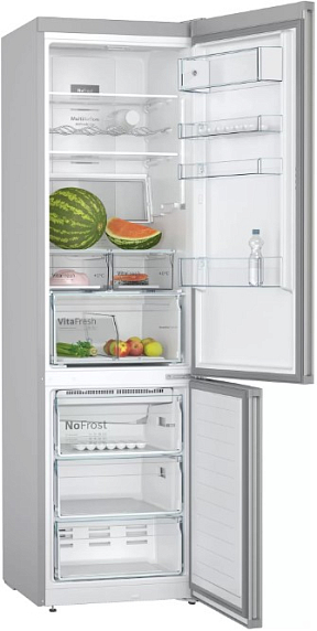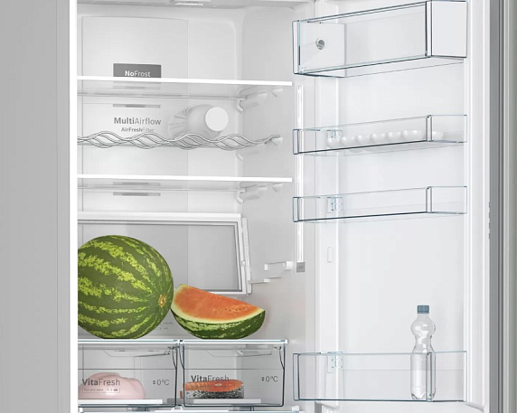 Bosch KGN39XI28R — двухкамерный холодильник, который подстраивается под вас! Полка Garage Shelf может складываться пополам, чтобы вы могли поставить большую кастрюлю или высокую упаковку молока. Еще вы можете сложить полку полностью, чтобы получить больше пространства и положить, например, арбуз.