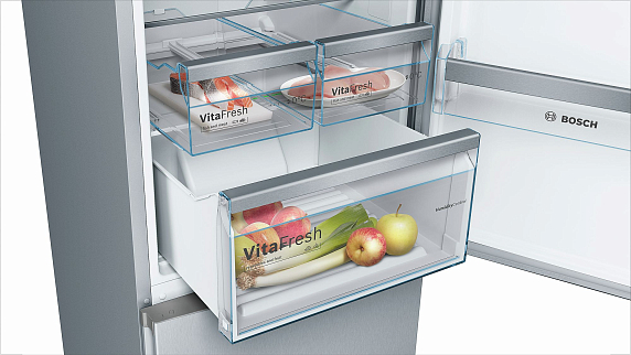 Зона VitaFresh с волнистым дном и настройкой влажности поможет сохранить свежесть овощей и фруктов, например, зеленого лука и клубники, надолго. Фильтр Airfresh с антибактериальной защитой antiBacteria, встроенный в систему вентиляции, нейтрализует запахи внутри холодильника, чтобы продукты сохраняли свой естественный аромат и вкус.