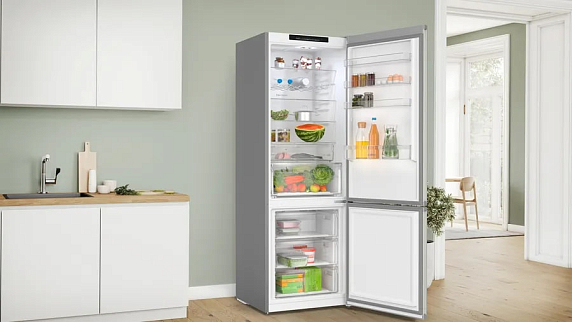 Двухкамерный холодильник Bosch KGN492IDF оснащен общем полезным объемом 440 л пространство, распределёно между холодильной зоной 311 л и морозильным отделением 129 л, что обеспечивает простор для повседневных запасов и сезонных покупок. Интерьер выполнен с акцентом на удобство и долговечность: пять полок, из которых три регулируемые и две фиксированные, изготовлены из высокопрочного стекла, безопасного к эксплуатации и простого в очистке, а специальная полка для бутылок и четыре удобных кармана на дверце оптимизируют хранение напитков и мелкой тары. LED-освещение равномерно освещает внутреннее пространство, делая продукты визуально доступными на любой полке. Зона свежести VitaFresh с регулируемым климатом продлевает срок хранения овощей, фруктов и мяса, сохраняя структуру и полезные свойства за счёт контролируемой влажности и щадящего температурного режима.