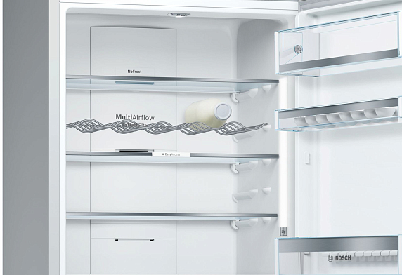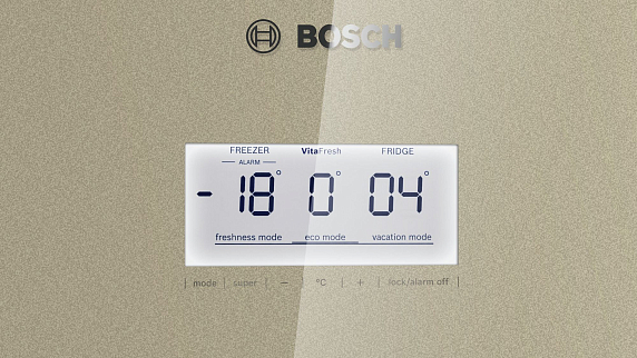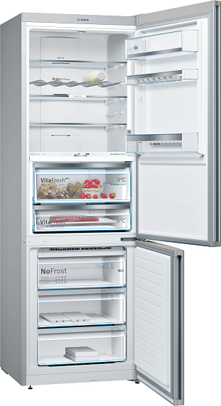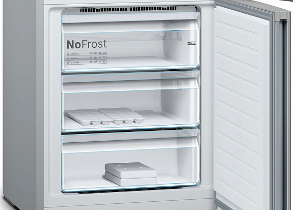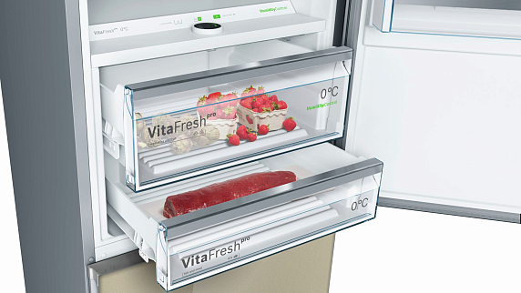 Зона VitaFresh pro с настройкой температуры и влажности, предусмотренная в этой модели, содержит не только ящик для овощей и фруктов, но также для рыбы и для мяса, увеличивая их срок годности почти в 3 раза. Источники света расположены таким образом, что не перекрываются продуктами, поэтому содержимое полок прекрасно просматривается. Технология NoFrost защищает камеры от образования льда, поэтому прибор не требует разморозки.