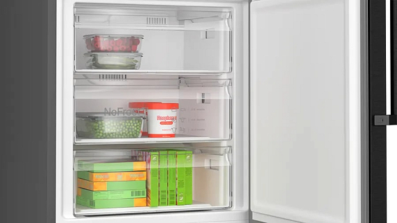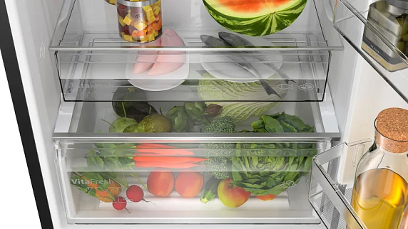 В холодильной камере установлено пять полок, из которых три регулируемые и две фиксированные. Полки из высокопрочного стекла не только удобны в использовании, но и придают устройству эстетический вид. Кроме того, в холодильнике есть полка для бутылок и четыре полки на дверце, что позволяет максимально эффективно использовать пространство. Особое внимание заслуживает зона свежести VitaFresh, которая обеспечивает оптимальные условия для хранения овощей, фруктов и мясных продуктов. В морозильной камере установлены три ящика, что позволяет удобно разместить продукты. А функция суперзамораживание SuperFreezing обеспечивает быстрое замораживание продуктов, сохраняя их полезные свойства.