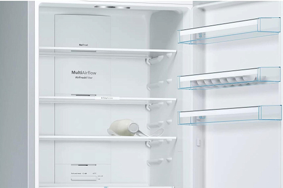 В холодильной камере есть четыре полки, три из которых можно регулировать по высоте, а также выдвижные полки EasyAccess для удобства использования. Кроме того, есть специальная полка для бутылок и четыре полки на дверце, что позволяет эффективно использовать пространство холодильника. В холодильнике также есть зона свежести VitaFresh 0°С, которая идеально подходит для хранения мяса и рыбы.