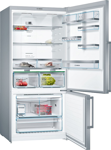 Двухкамерный холодильник Bosch KGN86AI30R — это вместительная отдельностоящая модель с морозилкой, расположенной внизу. Общий полезный объем составляет 619 л, из них холодильное отделение 479 л, а морозильное — 140л. Габариты прибора (ВхШхГ): 186×86×81 см. Фронтальная поверхность сделана под нержавеющую сталь и имеет покрытие, оберегающее от загрязнений и отпечатков пальцев, а цвет корпуса — «серебристый металлик».