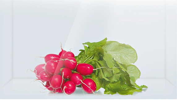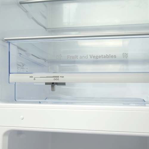 - наличие специального контейнера для овощей и фруктов, объемом 26 л. Внутри него поддерживается оптимальные влажность и температура, при этом выступивший конденсат скапливается между выемками рифленого дна, предотвращая постепенное гниение нижнего слоя;
