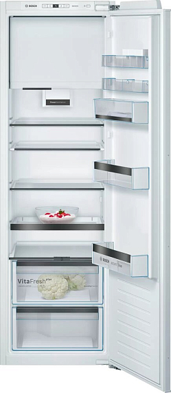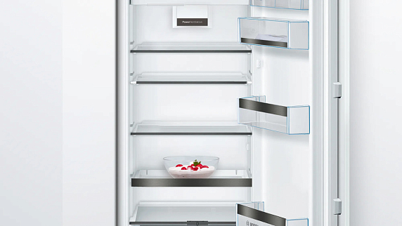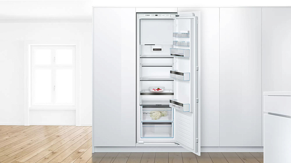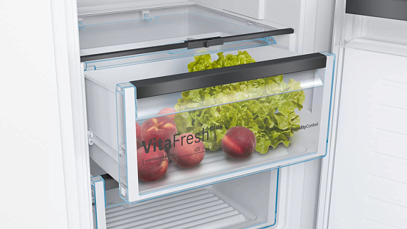 Однокамерный холодильник Bosch оснащен зоной свежести VitaFresh: в ней вы можете хранить при 0°С мясо, рыбу, а также овощи и фрукты. Функция Super Cooling на короткое время понижает температуру, для новых продуктов. Светодиодное освещение отлично освещает все полки внутренней камеры и не создает бликов.