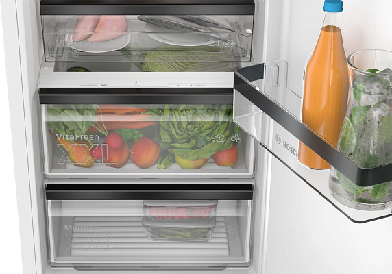 Особое внимание уделено сохранению свежести: зона VitaFresh поддерживает оптимальные условия для овощей, фруктов и мяса, сохраняя сочность, текстуру и питательные вещества дольше стандартного хранения. Индикация открытой двери реализована световыми и звуковыми сигналами, что предотвращает потери холода и помогает экономить электроэнергию; в случае неполадок предусмотрена комбинированная светозвуковая сигнализация об ошибке. Электротехнические параметры адаптированы под стандартную сеть 220–240 В и частоту 50–60 Гц, при необходимости устройство защищено предохранителем на 10 А, а длина сетевого кабеля равна 1,6 м, что обеспечивает удобство при монтаже.