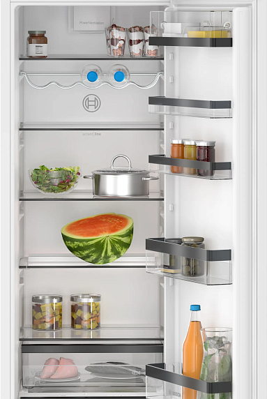 Встраиваемый однокамерный холодильник Bosch KIR81SDD0 имеет аккуратную встраиваемую конструкцию, которая гармонично скрывается в кухонном гарнитуре, сохраняя единый интерьер. Корпус разработан с учётом компактности: при высоте 177,2 см и ширине 55,8 см устройство занимает минимальную нишу, размеры которой составляют 177,2–178 х 56 х 55–56 см, а при необходимости дверной упор можно перенавесить — заводская конфигурация правая. Встраиваемая модель не имеет морозильной камеры, что обеспечивает крупный полезный объём для охлаждения продуктов — 310 литров общей ёмкости, полностью доступной для хранения свежих ингредиентов и готовых блюд. Современные пропорции и аккуратные линии фасада создают ощущение лёгкости и функциональной элегантности, подходящей как для классических, так и для минималистичных кухонь.